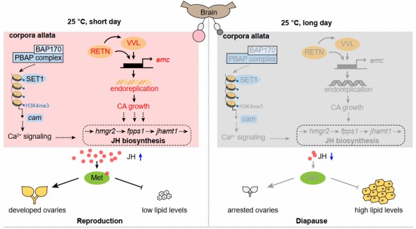 为应对季节更替带来的周期性环境变化,许多昆虫进化出“滞育”这一关键生存策略,通过暂停发育、降低代谢并储存能量,以度过严寒、酷暑或食物匮乏等不利条件。然而,在农业生态系统中,滞育也为害虫种群的维持与暴发提供了重要基础。因此,若能识别并调控滞育的关键“开关”,有望为害虫防控开辟新的路径。保幼激素(JH)水平下降是诱导生殖滞育的核心生理信号,但在分子层面,光周期等季节性信号如何调控JH合成并启动滞育,长期以来仍缺乏清晰认识。