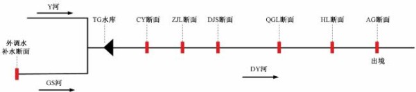 TG水库位于DY河上游,是DY河生态补水的主要水源,对整个河道的径流起着调节与控制作用;CY断面、ZJL断面、DJS断面、QGL断面、HL断面、AG断面为DY河上的水文监测断面,其中AG断面为DY河流出某省的出境断面。