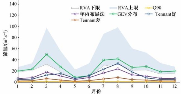 (1)两个阶段生态适应性理论计算的河道内生态流量过程均在RVA阈值区间内;Tennant好所计算的生态流量过程在天然阶段仅有一个月(8月)满足RVA阈值,在人类干扰阶段有四个月(5-8月)满足RVA阈值;其余方法所计算的生态流量均不满足RVA阈值。