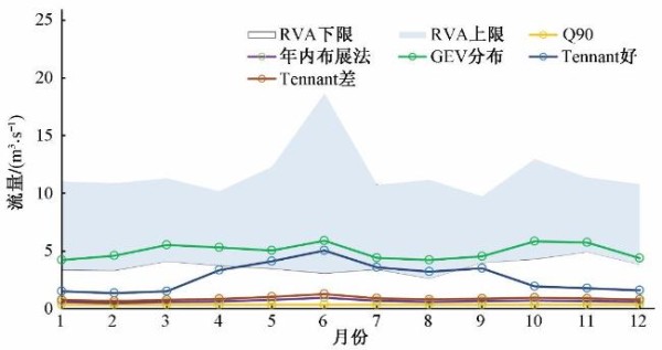 不同方法计算的生态流量结果以及RVA生态流量阈值区间汇总见