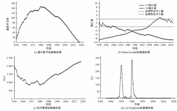 水文变异是指某一水文序列在某一时间节点前后的统计规律发生显著变异。针对水文序列变异诊断的方法有很多种,本文首先利用累计距平法[18]对径流序列进行趋势分析,再利用Mann-Kendall突变检验[19]、有序聚类法[20]、Lee-Heghinian法[21]对可能存在的变异点进行初步筛选,最后利用秩和检验法[22,23]对变异点进行显著性分析,以此确定径流序列的最终变异点。