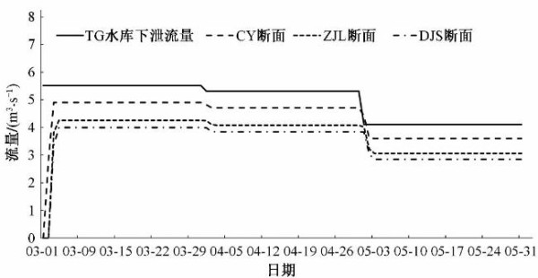 DY河生态补水过程中,存在外调水源补给,即通过GS河将外调水存蓄于TG水库中,继而补给TG水库下游DY河。