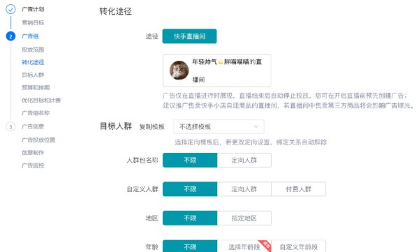 直播观看出价0.1元起、商品访问1元、订单支付5元起,上限统一5000元,防止烧光预算无转化