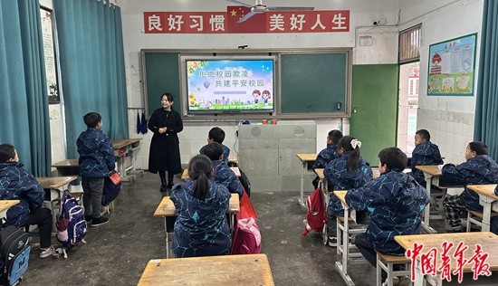 在重庆市奉节县长安土家族乡黄龙小学,师生组织开展“拒绝校园欺凌,共建平安校园”主题班会。中青报·中青网记者李川/摄
