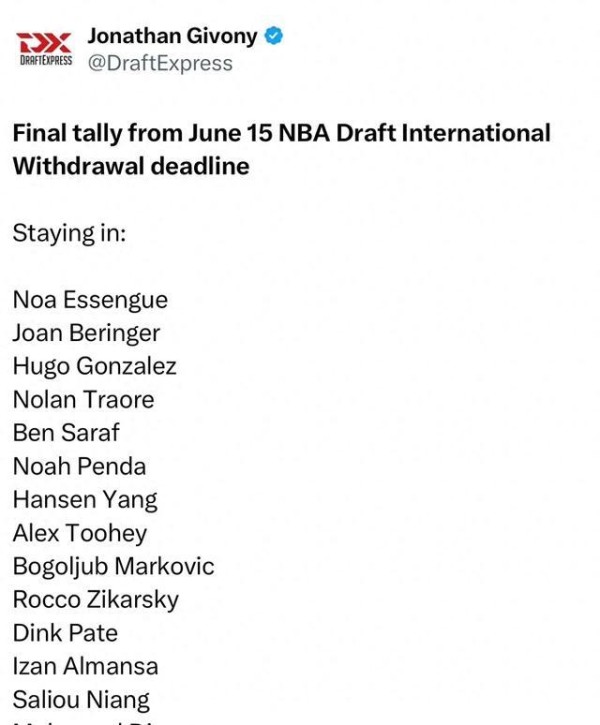 网址:选秀退出人数超六成!杨瀚森首轮有望,林葳也能争取机会 https://klqsh.com/news/view/359848