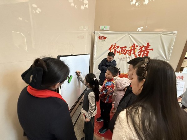 春节期间,成语博物馆内举办的“你画我猜”活动,小游客两人一组正在猜词。新华网 普韵乔摄