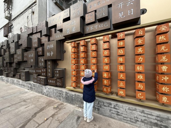 沿着邯郸道一路前行,每一步都能与成语“撞个满怀”:回车巷里的浮雕墙上,“将相和”的历史场景栩栩如生,将课本里的历史故事生动再现;街区的墙面、路灯杆、指示牌上,成语标识随处可见,春节期间悬挂的灯笼、装饰也巧妙融入成语元素,文化气息扑面而来。