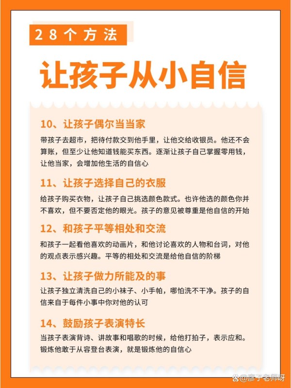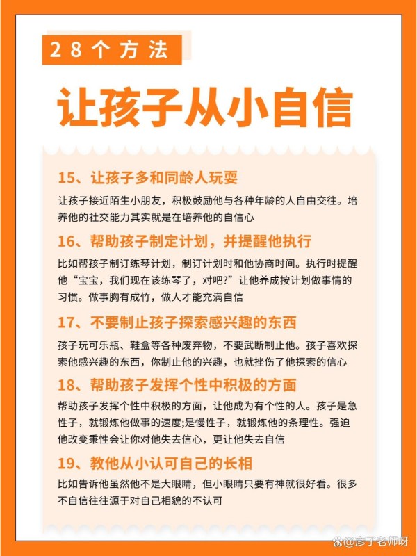 总之,培养孩子从小就自信需要家长和教育者的共同努力。通过给予支持和鼓励,培养兴趣和才华,鼓励他们尝试新事物,提供自主权和责任感,建立良好的人际关系等方法,可以帮助孩子培养自信心,为他们未来的成长奠定坚实的基础。 #百家快评#