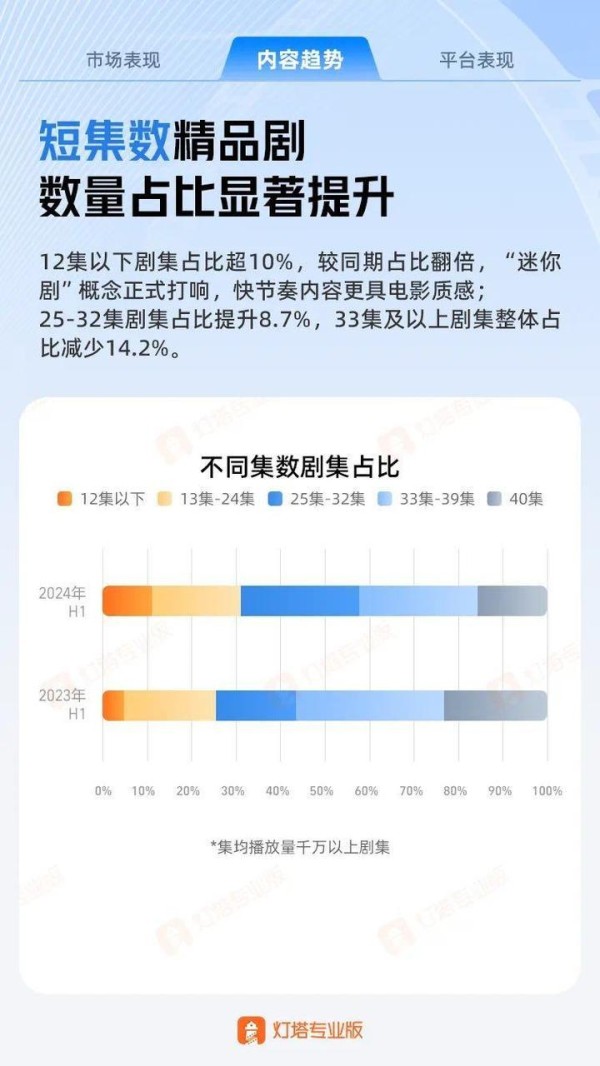 据灯塔报告显示,今年上半年的剧集市场,12集以下剧集的占比超过10%,相较于去年同期实现了翻倍增长。同时,25集到32集的剧集市场份额也有所增加,提升了8.7个百分点,而33集及以上剧集的整体占比减少了14.2%。