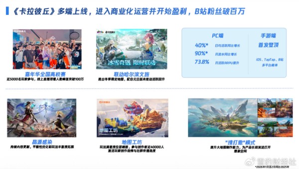 期内,《卡拉彼丘》多端上线并进入商业化运营。PC端于2026年初实现日均活跃同比增长40%,月流水同比增长90%,月活跃ARPU提升73.8%。手游端于2025年10月首发即登顶iOS、TapTap、B站等多平台榜单。