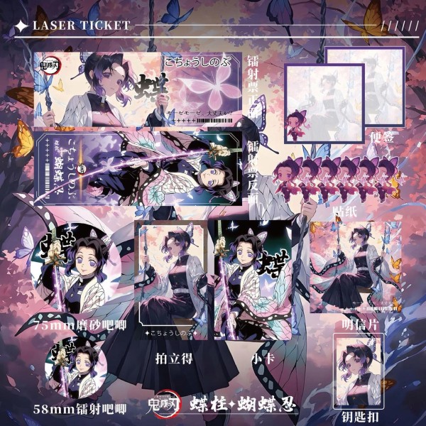 这套15件套的鬼灭之刃蝴蝶忍周边礼盒,堪称二次元社交的"六边形战士"。镭射票设计采用了无限城场景的渐变光影效果,在灯光下会呈现出蝴蝶羽翼般的七彩流光;吧唧徽章采用锌合金电镀工艺,边缘做了防刮手处理;钥匙扣则暗藏玄机——轻轻按压蝴蝶翅膀,会有细微的弹簧震动反馈,模拟蝴蝶振翅的触感。