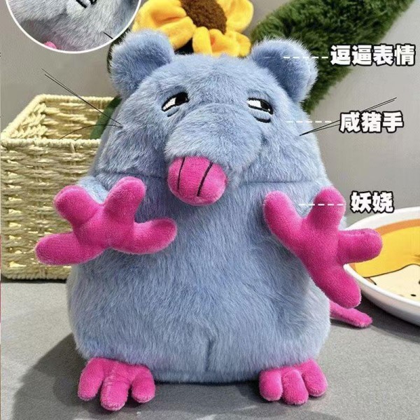 这只抱着披萨的老鼠完美诠释「丑到极致就是萌」——歪斜的门牙搭配狡黠的眼神,绒毛里还藏着几处故意做旧的污渍设计。但当你捏它鼓囊囊的肚子时,填充的pp棉会给出超治愈的回弹感,特别适合压力大的时候暴力揉搓。