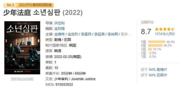 其实说到少年犯罪题材,就不得不提韩国的《少年法庭》,这部剧和《正义女神》一样,都聚焦未成年人犯罪,不过它更深刻、更尖锐,豆瓣评分高达8.7分,播出时还冲进了Netflix全球七十多个分区的热播前十。