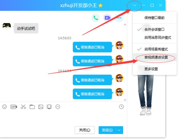 方法二:通过qq的对话框,随便打开一个好友的对话 框,点击右上角的下拉按钮,然后,“音视频通话设置”