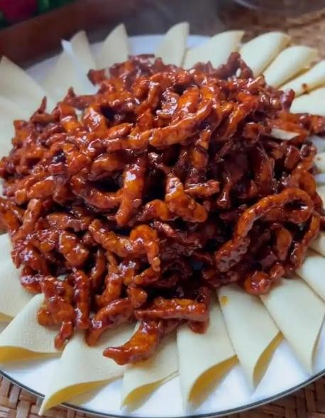 回锅牛肉丝:把炒好的牛肉丝重新倒入锅中,与酱汁一起翻炒均匀,使每一根牛肉丝都均匀裹上酱汁。最后,将京酱牛肉丝盛出,搭配黄瓜丝食用,口感丰富,酱香浓郁,是一道下饭好菜。