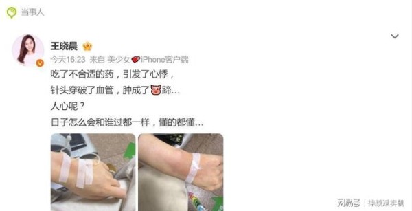 4月13日,王晓晨在个人微博详细描述了这场突如其来的“连环劫”。起因是她服用了“不合适的药”,直接引发了心悸,不得不紧急就医。屋漏偏逢连夜雨,在医院输液治疗时,又遭遇了医疗操作失误——针头穿破了血管,导致药液外渗。从她晒出的情况看,手臂和手部因此出现了严重肿胀,她自己用“肿成了猪蹄”来形容,场面着实令人心疼。