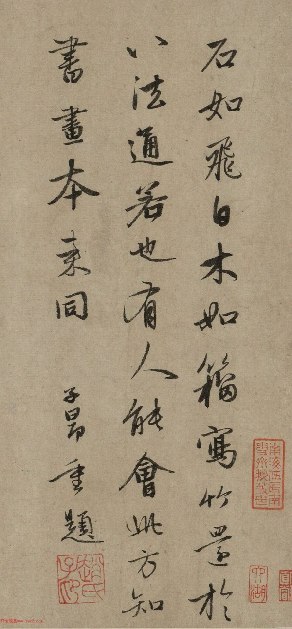 赵孟頫自题七言绝句:“石如飞白木如籀,写竹还于八法通。若也有人能会此,方知书画本来同。”子昂重题。