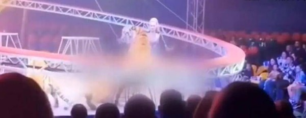 俄罗斯马戏团一只老虎跳出舞台跑进观众席