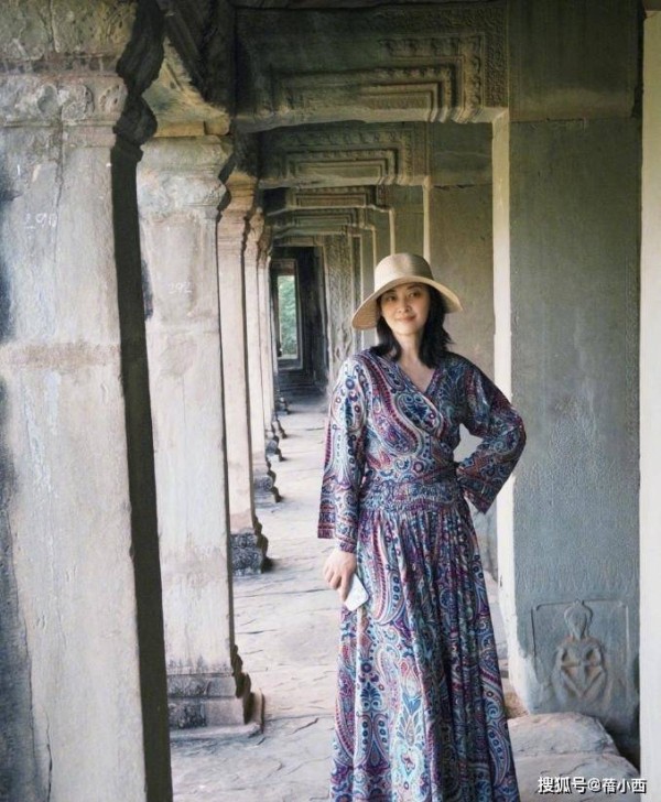 和职场风的利落不同,梅婷的度假穿搭完全是另一种风格,穿上一条全身都是红蓝配色花纹的长款连衣裙,搭配一顶宽檐草帽,站在古建筑里的她,像自带滤镜一样,把中年女性的松弛氛围感穿到了极致。