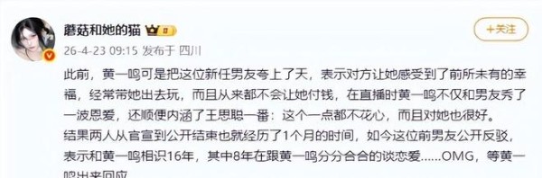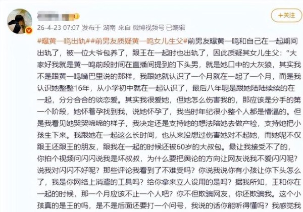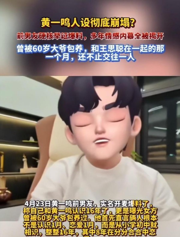 那个靠着“王思聪孩子妈”人设吃了三年流量红利的网红黄一鸣,竟然被自己相识16年的青梅竹马前男友,用一条实名视频给锤懵了。 视频里不仅曝出她被60岁大叔包养,更直接抛出一个炸翻全网的疑问:孩子,真是王思聪的吗?