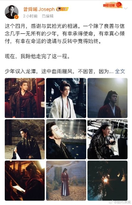 #曾舜晞说了4个谢谢##曾舜晞连说4个谢谢# 谢谢导演给了我“拾光”的机会。谢谢与主创及幕后工作人员一起并肩无数日夜的时光和优酷对剧集的支持。谢谢所有看见武拾光、为他倾注信任与爱、让我真切感受到温暖的你们。谢谢你,武拾光。曾舜晞太体面了,武拾光很好,曾舜晞很好