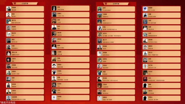 本届评选共设置小说作家、文学作家、跨界作家、人气名师、青年作家、人文社科作家、财经作家、励志作家、中国儿童文学作家、中国原创绘本画家、中国儿童人文科普作家、中国人气童书作家、动漫作家、亲子养育作家、心理学作家、生活方式作家、艺术作家、科普科技作家、外国影响力作家等19个榜单,共有320位作家入围获奖。评选活动自启动以来,吸引了全国数百万读者踊跃投票。