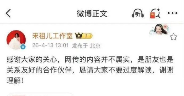 面对不断升温的猜测,宋祖儿工作室很快给出了回应:两人只是朋友与合作伙伴关系。
