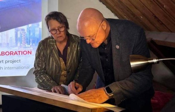 4月24日,在荷兰鹿特丹,欧亚文化交流基金会创始人扬·斯塔普(右)与TOT创始人拉姆赛尔签署合作协议。 新华社记者 邵海军 摄