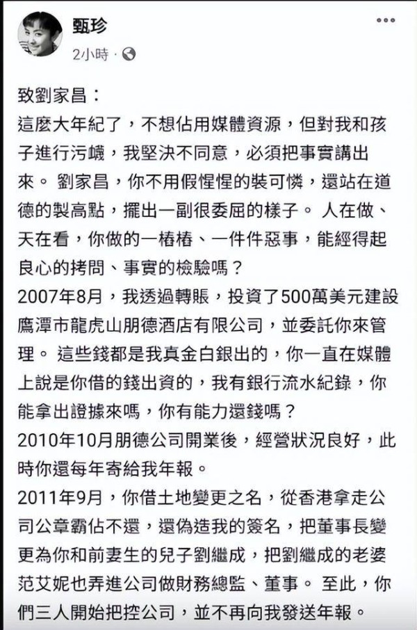 更难堪的是,离婚多年后,两人仍因财产问题撕破脸。刘家昌曾在社交媒体公开指摘甄珍与儿子,声称他们私吞约20亿新台币财产,甚至宣布断绝父子关系。甄珍随后强硬反击,贴出法院判决书回应,双方隔空互撕,昔日夫妻情分几乎被消耗殆尽。